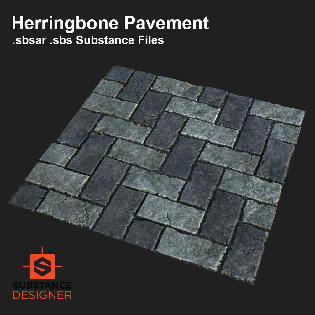 This is a weathered herringbone pavement Substance with .sbs and .sbsar packages. Weathering, cracks, pavement tile height and extra grime can be adjusted with sliders.