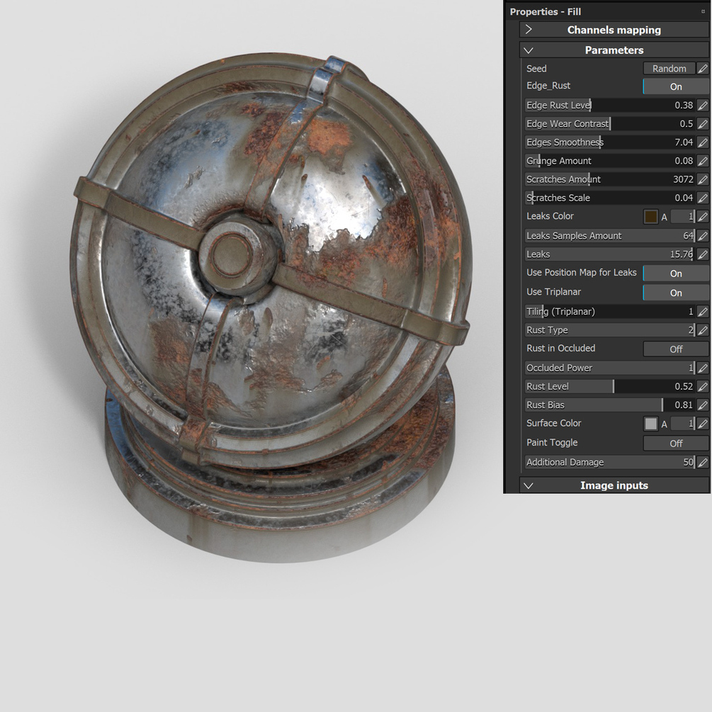 Also included are Smudges Generator, Better Painted Metal and Rusty Steel. These substances accept mesh maps such as Curvature and Ambient Occlusion as input for worn metal effects.
